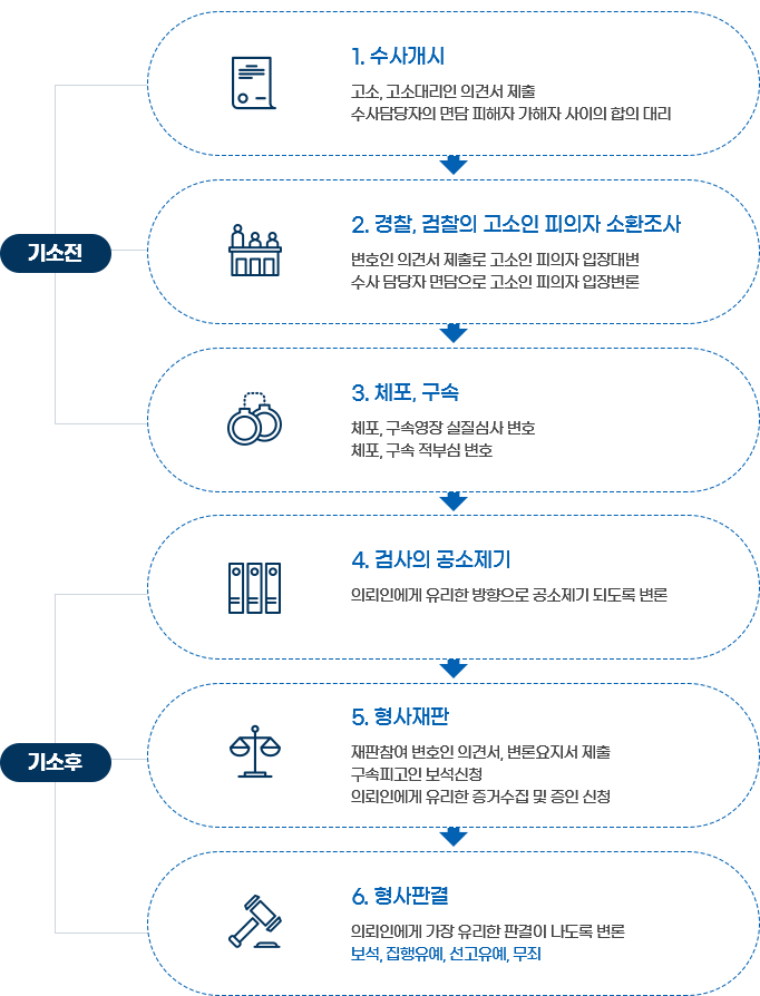 그러나, 피의자에게 죄가 없는 경우 수사단계부터 적극적으로 대처하여 아예 기소단계에 이르지 않게 하는 것이 중요합니다.